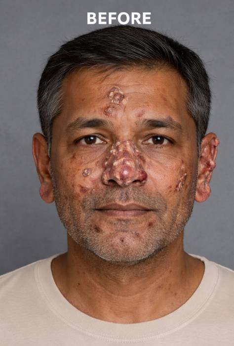 Before beginning treatment, patients may experience light or reddish skin patches, loss of sensation, numbness, or tingling in different parts of the body. Some individuals may develop dry, scaly lesions, nerve pain, muscle weakness, or thickened nerves near the elbows, knees, or neck. In more advanced cases, painless wounds, ulcers on the hands or feet, or eyebrow hair loss may be present due to nerve damage and reduced sensitivity.